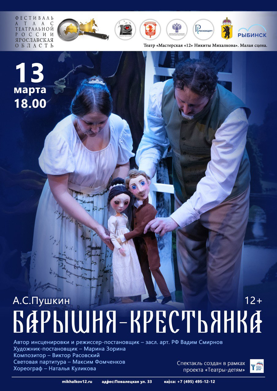 В Москве, 13 марта состоялся показ спектакля А.С.Пушкин «Барышня-крестьянка» (12+) Муниципального учреждения культуры «Рыбинский театр кукол» на малой сцене Мастерской «12» Никиты Михалкова в рамках Всероссийского фестиваля поддержки традиционных ценностей культуры и искусства регионов Российской Федерации «Атлас театральной России».