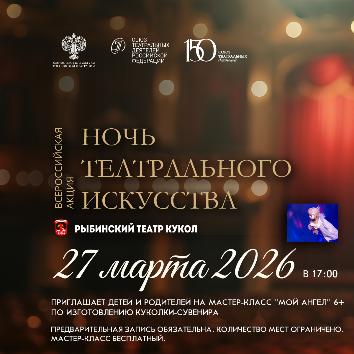В рамках Всероссийской акции «Ночь театрального искусства», посвященной 150-летию Союза театральных деятелей РФ в Рыбинском театре кукол 27 марта прошел творческий мастер- класс «Мой ангел» по изготовлению куколки-ангелочка из ткани и бумаги. Под руководством мастеров дети с родителями при совместной работе получили большое удовольствие от творческого процесса и унесли с собой куколку- ангела. Спасибо за мастер-класс мастерам и участникам. Все молодцы!