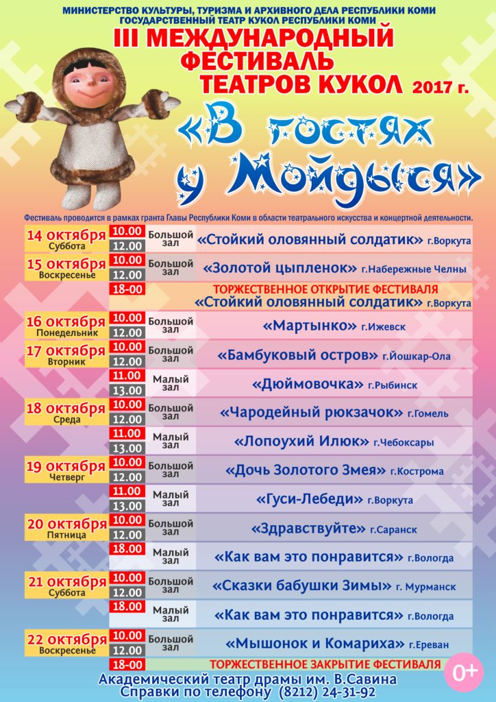 III Международный фестиваль театров кукол «В гостях у Мойдыся» прошел с 14 по 22 октября в Сыктывкаре. На сцене Академического театра драмы имени Виктора Савина свои спектакли представили 12 театральных коллективов из разных регионов России: Республика Коми г.Воркута; Республика Татарстан, г. Набережные Челны; Республика Удмуртия, г. Ижевск; Республика Марий Эл, г. Йошкар-Ола; Республика Чувашия, г. Чебоксары; Республика Мордовия, г.Саранск; г.Рыбинск, г.Кострома, г.Вологда, г.Мурманск, а так же г. Гомель ( Беларусь) и г.Ереван( Армения). На фестивале были показаны 13 спектаклей для детей и взрослых. Постановки отличались разнообразием жанров и техническими особенностями. Зрители фестиваля увидели и теневой театр, и театр с куклами различных систем, в том числе гапитных и перчаточных.