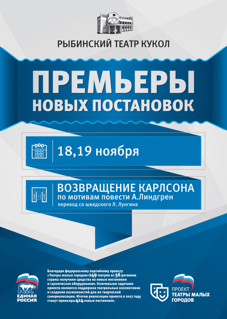 18, 19 ноября в нашем театре состоится премьера нового спектакля «Возвращение Карлсона» по мотивам повести А. Линдгрен, перевод со шведского Л. Лунгиной.