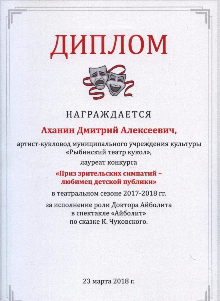 Поклонники театрального искусства выразили свое признание артистам Рыбинского театра кукол путем голосования на присуждение «Приза зрительских симпатий — Любимца детской публики». Приз вручили артисту Аханину Дмитрию Алексеевичу за исполнение роли доктора Айболита в спектакле «Айболит».