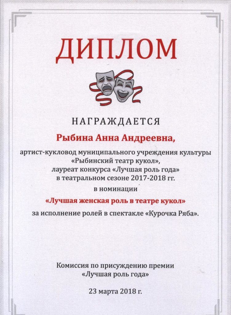 «Лучшая женская роль в театре кукол», в театральном сезоне 2017-2018 гг. признана артист Рыбинского театра кукол Рыбина Анна Андреевна,за исполнение ролей в спектакле «Курочка Ряба».