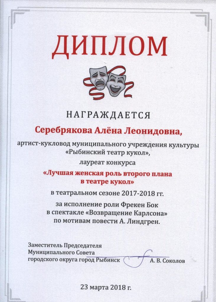 В номинации «Лучшая женская роль второго плана в театре кукол» победила артистка Рыбинского театра кукол Серебрякова Алёна Леонидовна, за исполнение роли Фрекен Бок в спектакле «Возвращение Карлсона».