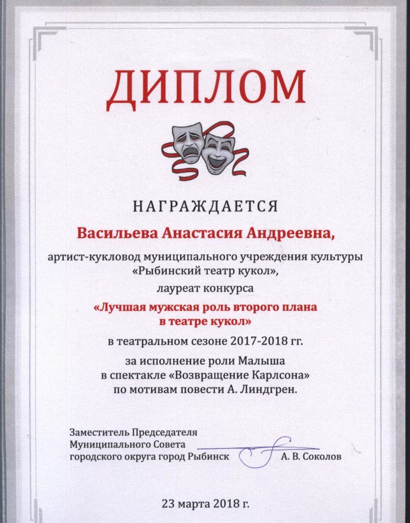 В номинации «Лучшая мужская роль второго плана»победила артистка Рыбинского театра кукол Васильева Анастасия Андреевна.за исполнение роли Малыша в спектакле «Возвращение Карлсона».