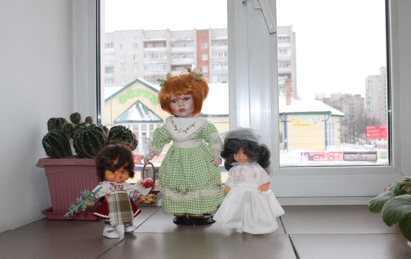Куклы могут быть разными: покупными, ручной работы, необычными, классическими. Оформленное окно нужно сфотографировать и прислать фото.