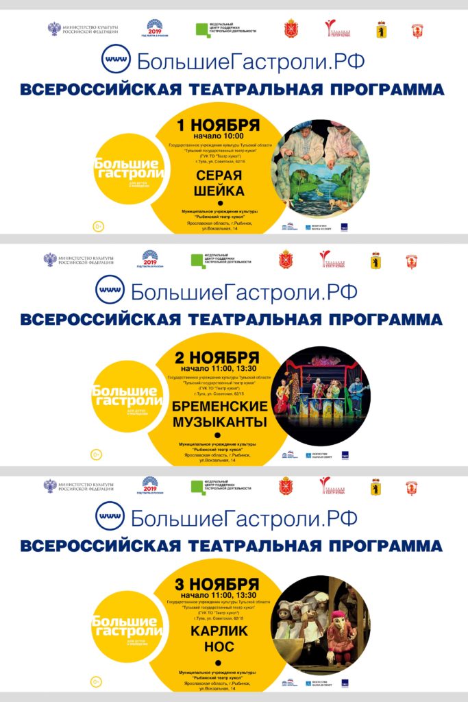 1,2,3 ноября в Рыбинском театре кукол в рамках общероссийской программы «Большие гастроли для детей и молодежи». «Большие гастроли» — общероссийская программа гастролей театров. В апреле 2019 года официально стартовали все направления программы «Большие гастроли», нацеленные на формирование общего культурного пространства России, расширение рамок творческого сотрудничества, привлечение новой зрительской аудитории на территории всей страны. Вот уже шестой год подряд в рамках программы «Большие гастроли» зрители могут увидеть лучшие постановки театров со всей страны — как спектакли, уже завоевавшие зрительское признание, так и премьеры. Масштабные гастроли проходят с полноценными декорациями, костюмами, полным актерским составом спектакля, участием звезд отечественного театра, предназначены для большой и малой сцены, для взрослой, семейной и детской аудитории. Программа «Большие гастроли для детей и молодежи» реализуется за счет государственных средств, выделенных Министерством культуры РФ по результатам поручения председателя правительства Дмитрия Медведева, данного по итогам форума «Единой России» «Культура — национальный приоритет» и входит в проект «Культура малой Родины», призванный обеспечить доступ всех граждан к участию в культурной жизни страны. География программы «Большие гастроли» простирается от Калининграда до Камчатки, от Дербента до Чукотки! 1,2,3 ноября в рамках программы «Большие гастроли для детей и молодежи» в Рыбинском театре кукол пройдут: ГАСТРОЛИ ГУК ТО «Тульский государственный театр кукол» 1 ноября в 10.00 «Серая Шейка» Трогательная история о попавшей в беду уточке, спасённой от злой лисы самоотверженным зайцем, знакома всем по сказке Д.Мамина-Сибиряка. А в нашем спектакле её рассказывают два весёлых охотника, которые так любят на привале вспомнить о каком-нибудь интересном случае из своей охотничьей жизни! Вот только «привал» этот мы максимально приблизили к зрителям, разместив детей прямо на сцене, рядом с декорацией и актёрской площадкой, что создаёт неповторимый эффект полной включённости ребёнка в происходящее. От того, например, как мгновенно осень превращается в зиму (это работают компьютерные технологии), у ребят просто дух захватывает! А детали обаятельных кукол, которых свалял из шерсти художник А.Лукомский, можно рассмотреть до мелочей. И вот эта близость зрителя и актёров не только не разрушает чуда театра, а, наоборот, лишь усиливает его. Именно такого эффекта добивался режиссёр спектакля А.Абрамов, автор инсценировки и замечательный фантазёр, подаривший ребятам возможность и душой потрудиться, и глазами насладиться, следя за всеми поворотами сюжета сказки. Действующие лица и исполнители: Первый Охотник – Антон Акимов Второй Охотник – Михаил Абрамов Инсценировка, режиссёр-постановщик – Андрей Абрамов Сценография, куклы, костюмы – Андрей Лкуомский Музыкальное оформление – Марина Гладнева Видео, анимация, компоузинг – Виктор Иевлев •Приз «Лучший спектакль»(Видеосюжет ВК) (II Межрегиональный фестиваль театров