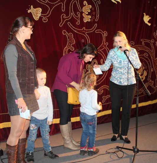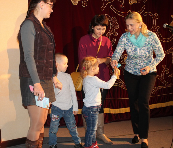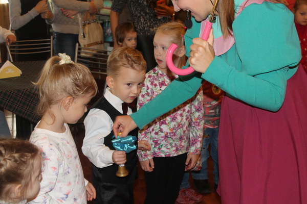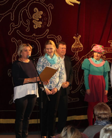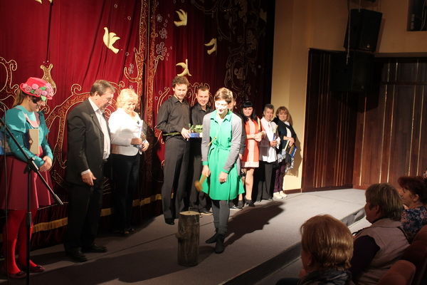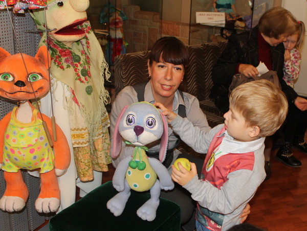 В вестибюле, все желающие. участвовали в фотосессии с любимым мульт персонажем –Свинкой Пеппой. О театральных куклах рассказала, познакомила и продемонстрировала зам. директора Ирина Дорожкина .Детям очень интересно было увидеть и подержать первый раз в руках настоящую ТЕАТРАЛЬНУЮ куклу. А когда прозвучали фанфары, к зрителям пришла Фея Здрасьте из сп. « Азбука вежливости» и объявили о том, что дать первый звонок предоставляется всем посвященным зрителям. Театральный колокольчик , передавая из рук в руки, возвестил о начале сезона и двери в зал распахнулись! В зале , когда прозвучал второй звонок, вновь появилась Фея Здрасьте, которая торжественно представила главного режиссера и артистов труппы нашего театра. Затем слово для поздравления предоставили начальнику управления культуры городского округа г. Рыбинск Ворониной М.К. Много добрых слов было сказано в адрес нашего театра и артистам. А ещё Марина Константиновна вручила Почетную грамоту Губернатора Ярославской области руководителю литературно-драматургической части Таруновой О.М. и почетную грамоту главы городского округа г. Рыбинск специалисту по кадрам Кротовой С.С. На этом поздравления и подарки не закончились. Слова поздравления прозвучали от зам. директора Дорожкиной И.В.и от директора театра Ивановой Е.А. , которая поздравила всех зрителей, работников театра и конечно же, артистов театра , вручив сладкие подарки и торжественно объявила об открытии 84-го театрального сезона! Много хороших слов прозвучало в адрес любимых зрителей и артистов от главного режиссера театра Александра Владимировича Быкова . Ему же представилась почетная миссия : принять в труппу театра , артистку Валентину Смирнову, которая начинает работу в театре. Валентине торжественно вручили символический гвоздь-традиция нашего театра, и настоящий гвоздь, который она вбила в театральный бутафорский пень. И мы надеемся, что Валя будет долго служить в нашем театре кукол! В завершении торжественной части прозвучали бурные аплодисменты благодарных зрителей! В этот день были сюрпризы и для зрителей! Руководитель лит.-драм. части Тарунова О.М. вручила пригласительные билеты почетным зрителям открытия театрального сезона, и повезло им не случайно. Почетный зритель сидел в 8 ряду, место 4, а сезон у нас 84-ий и зритель во 2 ряду, место 4, потому что открытие нового сезона состоялось 24 сентября. Им же представилась почетная миссия- дать 3 театральный звонок на премьерный спектакль «Царевна-лягушка»!