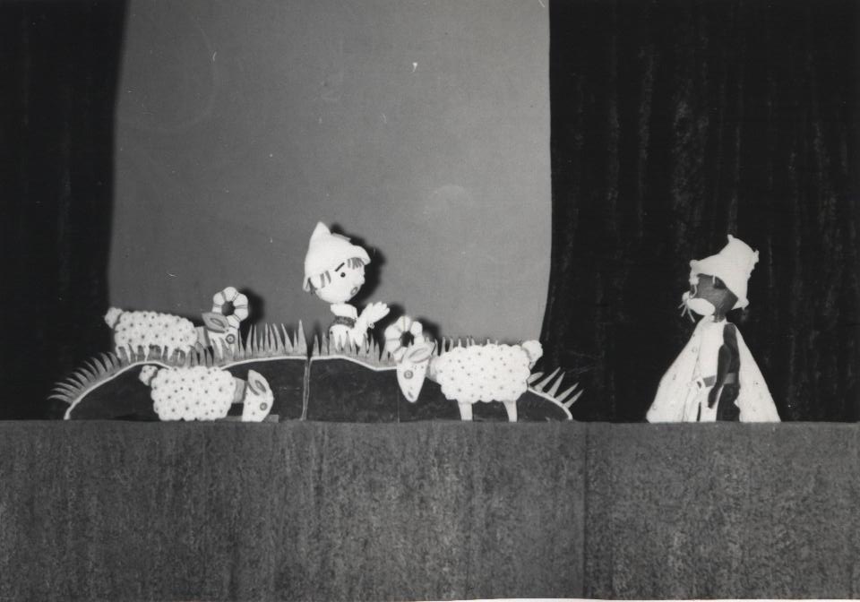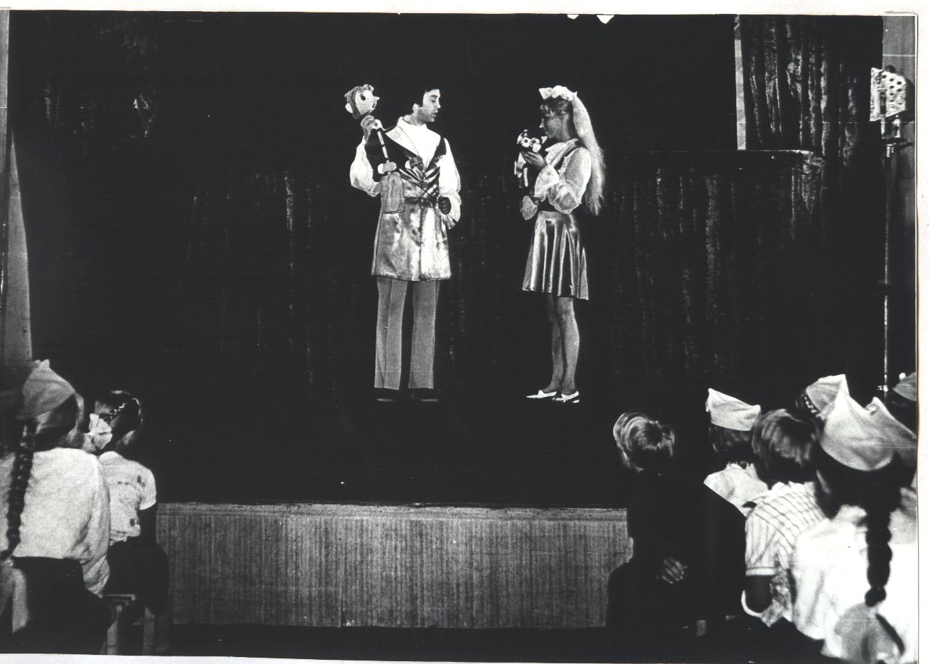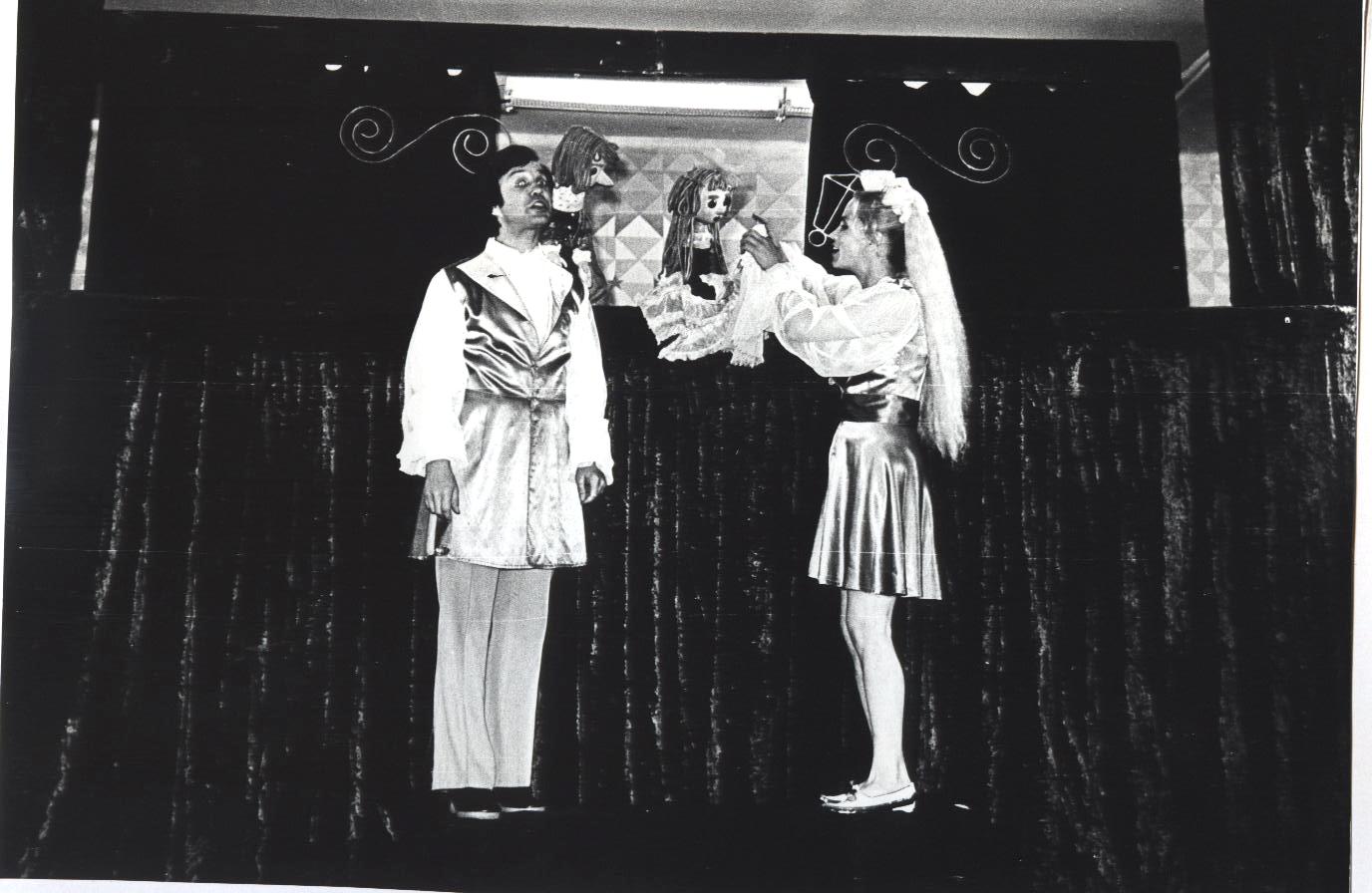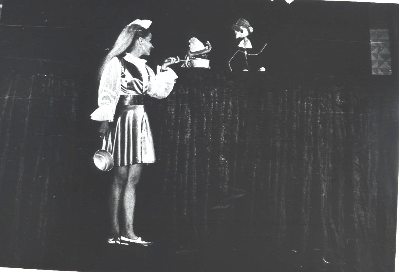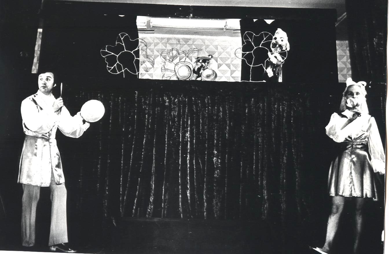 Редко встретишь ребят, которые бы в детстве не прочли замечательные сказки Шарля Перро. «Кот в сапогах» ?– одна из них. Эта волшебная история оживала на Рыбинской сцене 3 раза( 1940 г., 1970 г., 2012 г), и юные зрители воочию видели героев, которых сначала являло их воображение, а потом они появлялись на сцене и дарили удивительные моменты общения, развлекали , уводя в мир фантазии, где игра актеров и мастерство постановщиков спектакля создавали волшебный мир удивительных превращений. Первый спектакль «Кот в сапогах» появился в репертуаре нашего театра еще до войны, в 1940 году. Режиссером — постановщиком спектакля стала основатель театра З.Н.Демидова. Спектакль «жил» в репертуаре до начала 60-х годов. А в апреле 1970, ровно 50 лет назад, в театре вновь приступили к созданию спектакля «Кот в сапогах». Режиссер- постановщик- В.А.Зайцев, художник- А.Белушкин. Спектакль играли на сцене до конца 90- х г.г. В архиве театра кукол сохранились несколько фото этого спектакля. На них артисты Н.Николюк и Т.Бутывская.