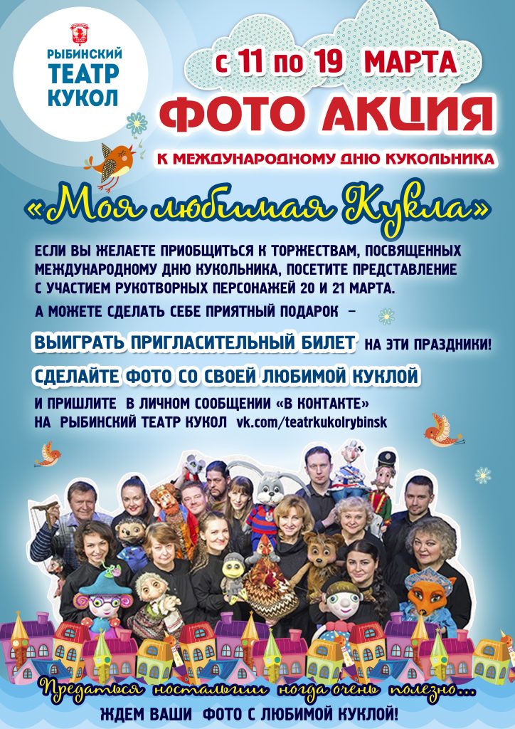 ФОТО АКЦИЯ «МОЯ ЛЮБИМАЯ КУКЛА», посвященная Международному дню кукольника проходит с 11 по 19 марта. Сделайте фото со своей любимой куклой и пришлите в личном сообщении «В Контакте» на Рыбинский театр кукол