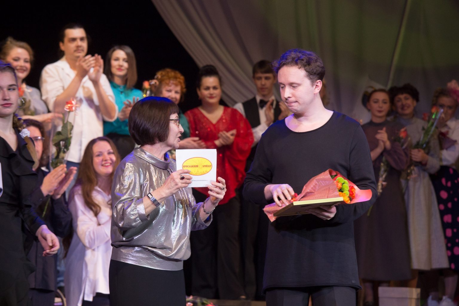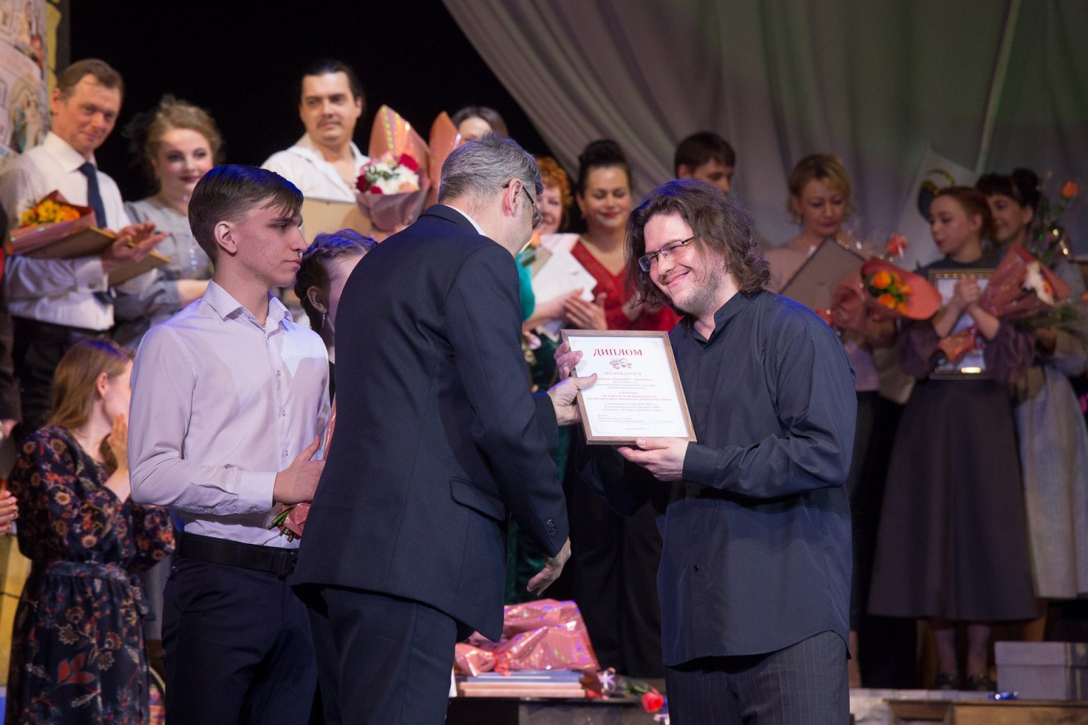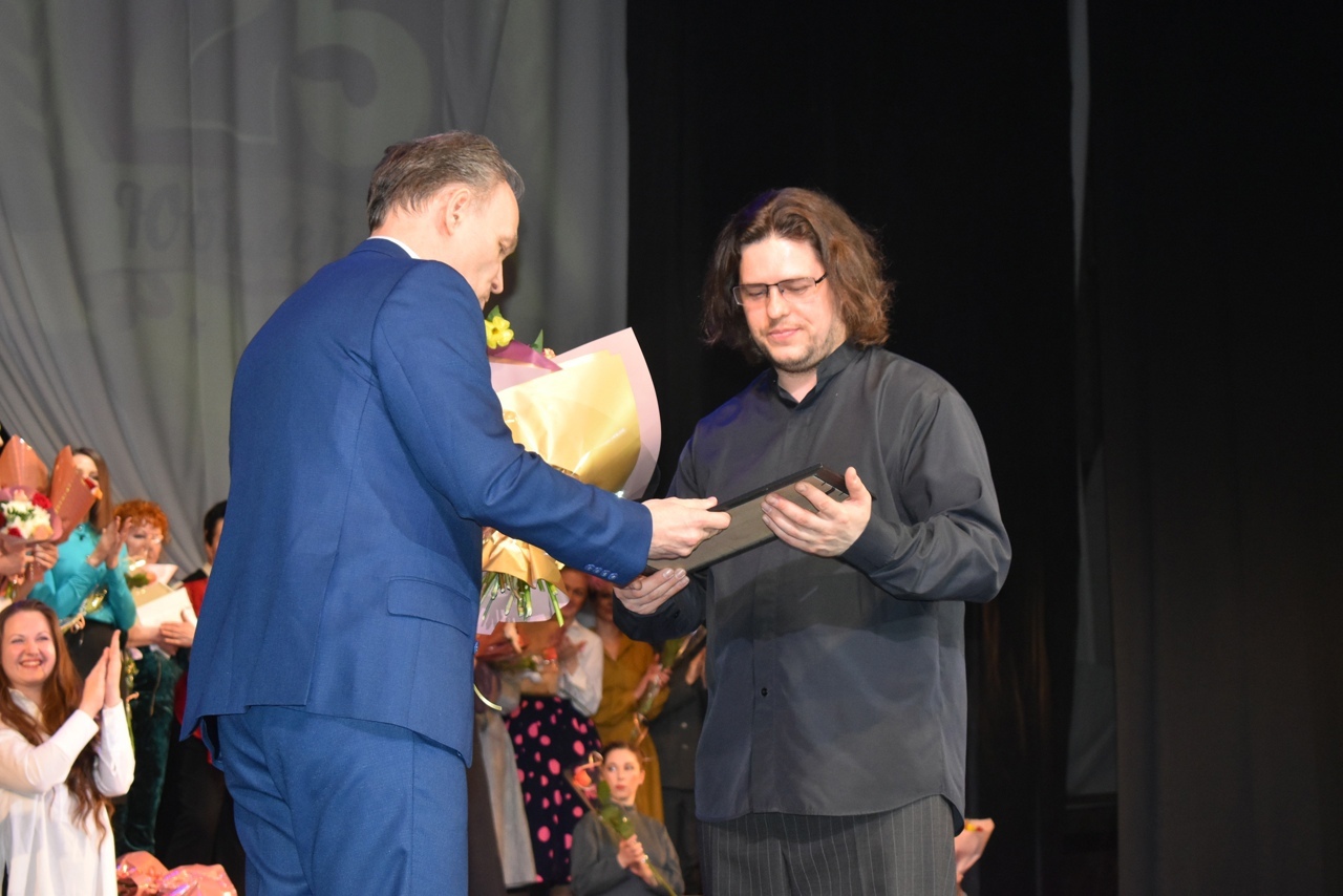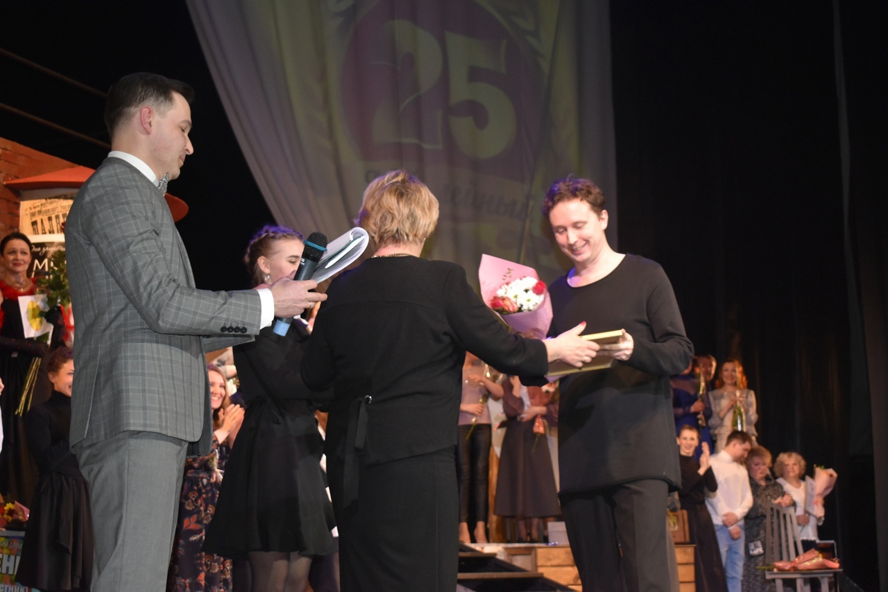 Депутат Муниципального Совета городского округа город Рыбинск Соколов А.В. вручил премию « За творческую индивидуальность, мастерство и яркое воплощение сценического образа» артисту Смирнову Дмитрию Константиновичу за исполнение роли Сотрудника ДПС в спектакле «В стране дорожных знаков» и премию « За создание спектакля в рамках проекта «Сказки народов мира» за постановку спектакля «Очень китайская сказка» главному режиссеру Александру Владимировичу Быкову.