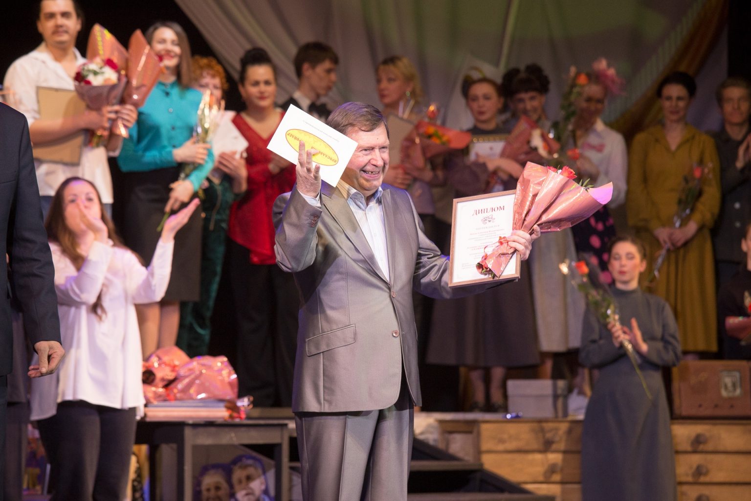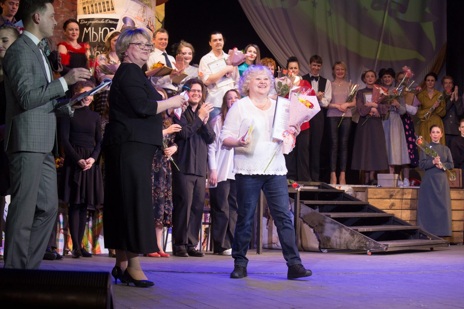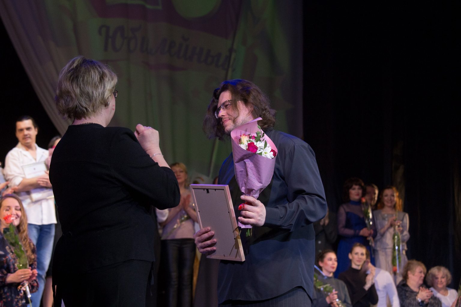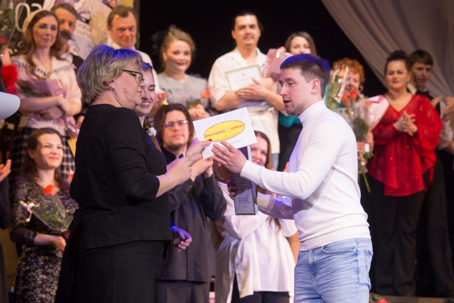 Депутат Муниципального Совета городского округа город Рыбинск Соколов А.В. вручил премию « За творческую индивидуальность, мастерство и яркое воплощение сценического образа» артисту Смирнову Дмитрию Константиновичу за исполнение роли Сотрудника ДПС в спектакле «В стране дорожных знаков» и премию « За создание спектакля в рамках проекта «Сказки народов мира» за постановку спектакля «Очень китайская сказка» главному режиссеру Александру Владимировичу Быкову.