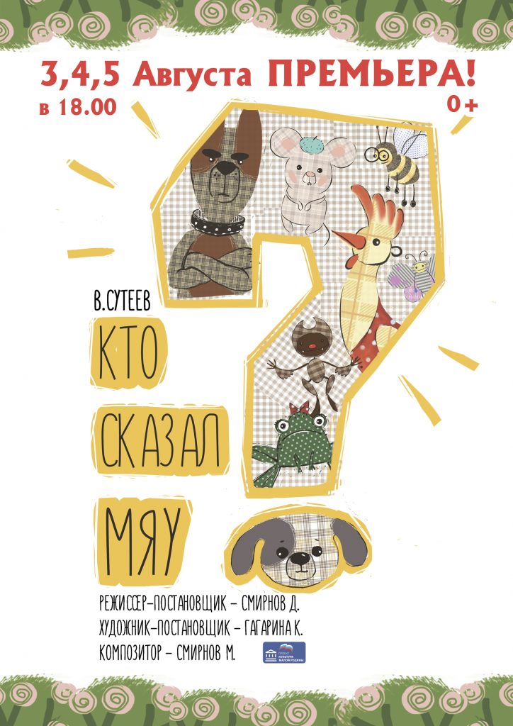 3,4,5 августа в 18.00 в рамках проекта «ТЕАТР НА ПОДУШКАХ» в Рыбинском театре кукол премьерный спектакль «Кто сказал «МЯУ»?»по сказке В. Сутеева.