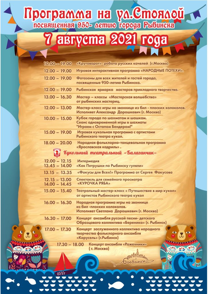 Рыбинский театр кукол приглашает гостей и жителей Рыбинска на праздничную программу , которая пройдет на ул. Стоялой с 10.00 до 20.00.