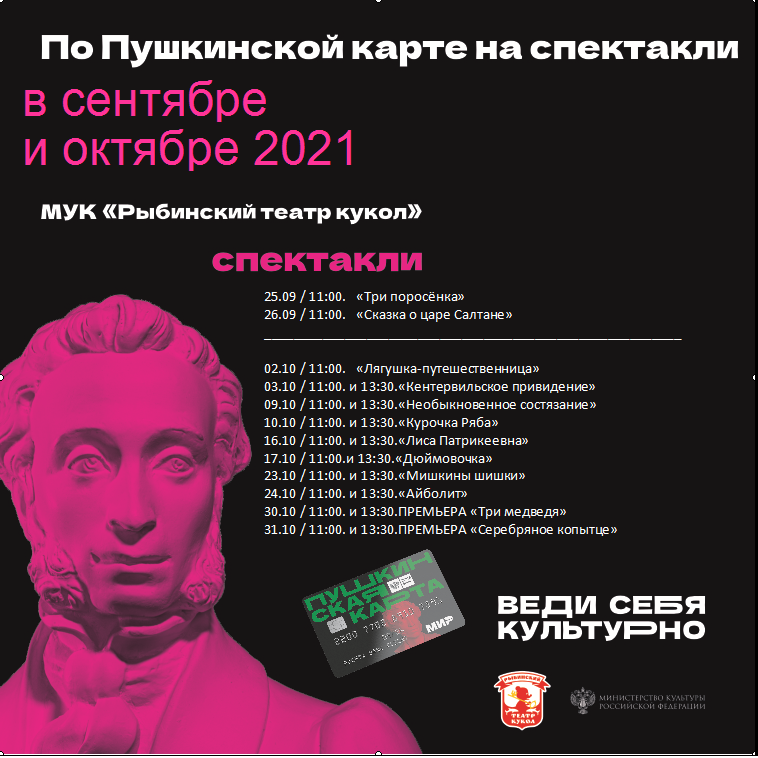 Уважаемые зрители.Оплата «Пушкинской картой» уже доступна.В сентябрьском репертуаре она действует на спектакли: 25 сентября в 11.00.спектакль «Три поросёнка». 26 сентября в 11.00. спектакль «Сказка о царе Салтане». В октябре на все спектакли, где обозначен профиль А.С.Пушкина . Продажа билетов онлайн http://quicktickets.ru/rybinskiy-teatr-kukol или в кассе театре кукол.